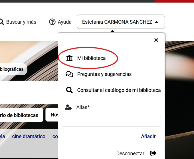Una vez iniciemos sesión, en lugar de «Acceso identificado» aparecerá nuestro nombre. Y si hacemos clic en nuestro nombre, se desplegará un menú. Ahí, haremos clic en «Mi biblioteca».