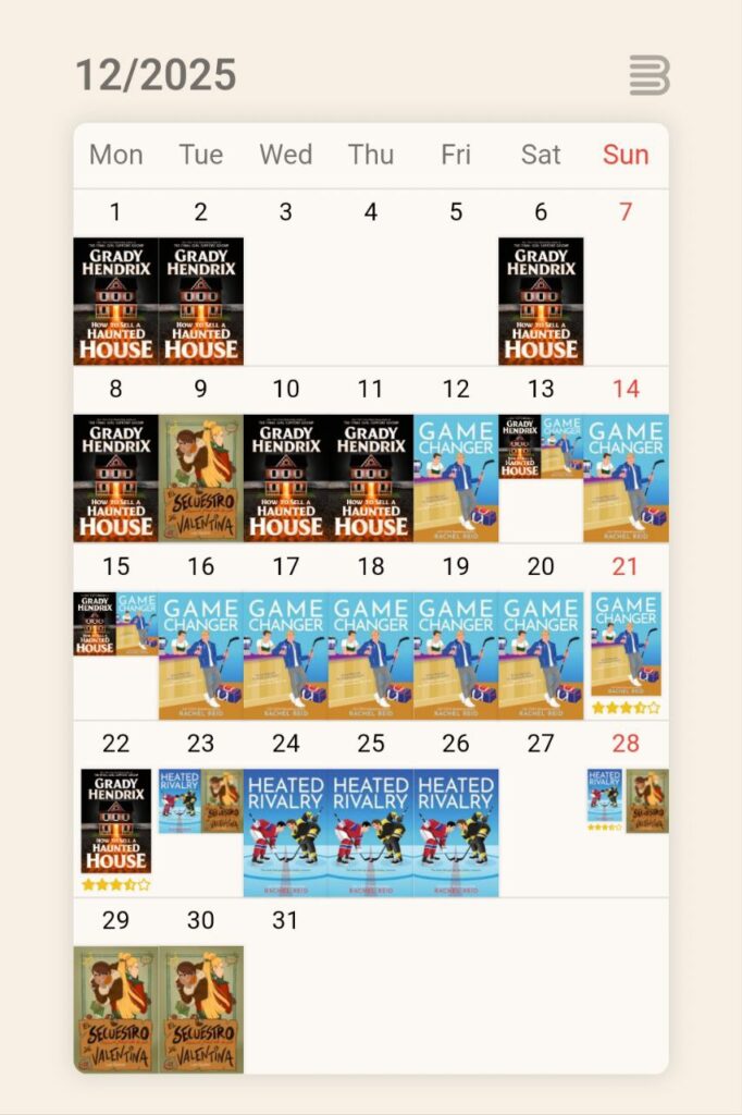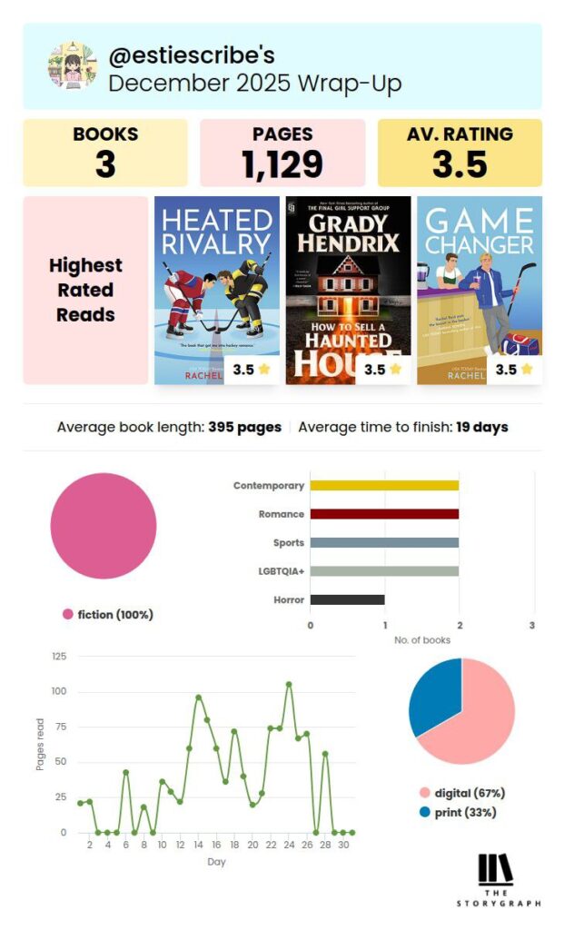 Este mes he leído algo más porque me enganché a Game Changer y Heated Rivalry y eso ha ayudado a que lea casi a diario. Voy a tomarme un par de semanas de desintoxicación de la saga y probablemente empiece los siguientes pronto, porque la verdad es que me he enganchado bastante a este sabor de sports romance concreto.