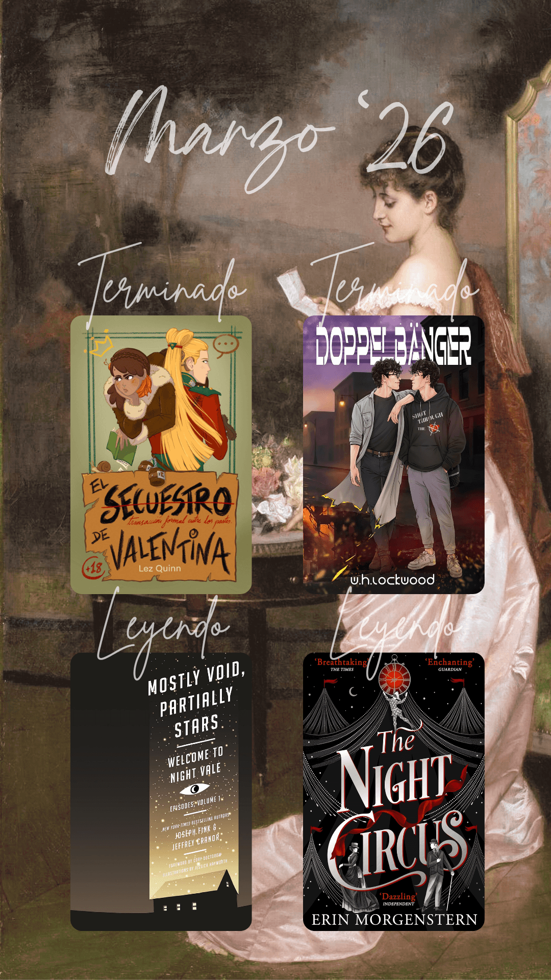 Para abril no voy a ser muy ambiciosa: quiero terminar lo que tengo empezado. A saber, The night circus, Mostly void, partially stars y Alchemised (que he terminado descargando para no tener que esperar a que esté disponible en la biblioteca). Una vez los termine quiero intentar volver a leer solo un libro a la vez, porque estas últimas semanas leer era como sentarse a hacer deberes, y no quiero eso.