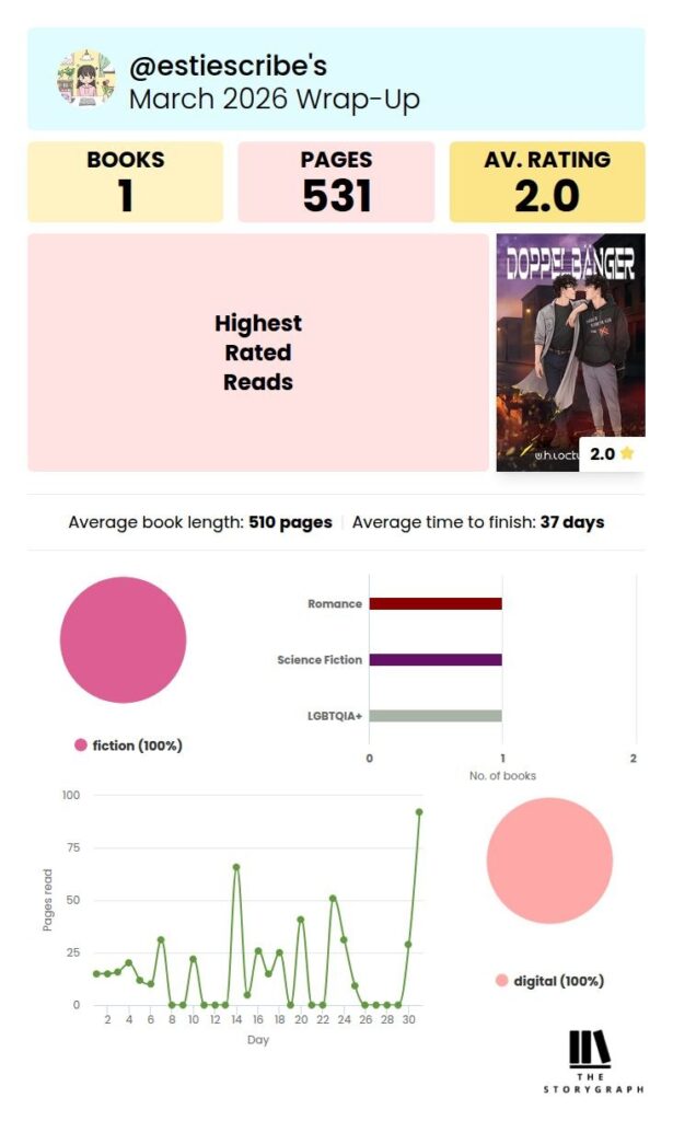 No hay nada mejor que ver brillar a tus amigas. Esta es una historia divertidísima y entrañable que espero que encuentre editorial pronto. Si he tardado tanto en terminar de leerla es porque la vida no deja de atropellarme. - Doppelbänger, de W.H. Lockwood. (★★☆☆☆, 9 h 48 min).