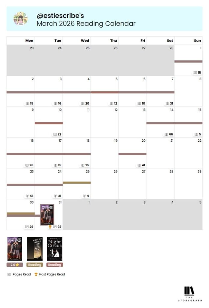 Mediocre y una decepción. La premisa me parecía muy interesante, pero ni se le ha sacado partido ni está bien escrito. Le sobran como cien páginas y para colmo no he conectado en absoluto con el intento de humor y casi me hace caer en un bloqueo lector. Todo mal. Lo peor es que aparece como mejor lectura de marzo porque es el único publicado que he terminado 😂