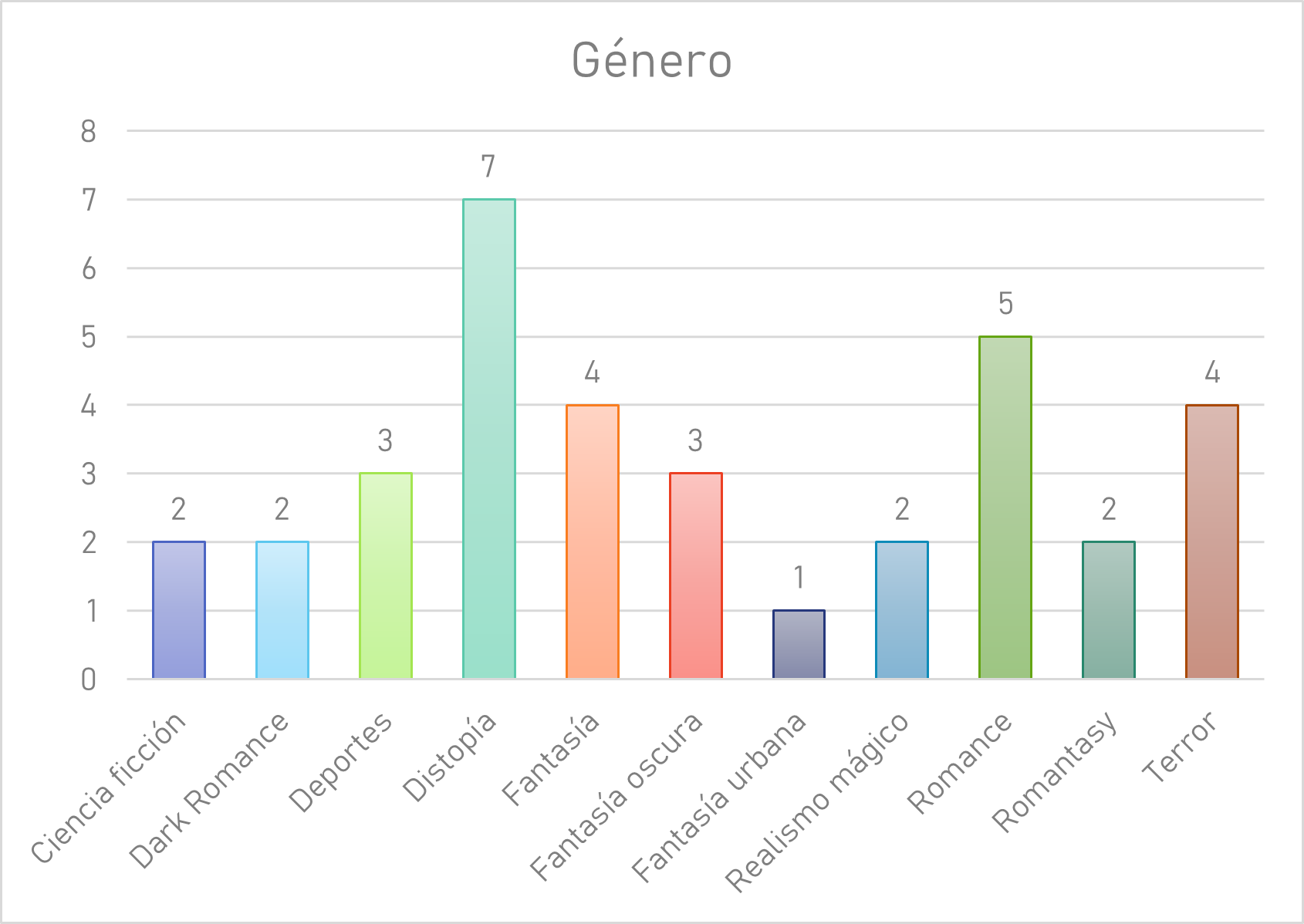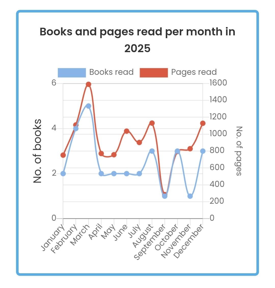 Me sorprende bastante la cantidad de páginas leídas en comparación con los libros (culpa mía, por adentrarme en monstruos como Alchemised); los géneros, la verdad es que no tanto 😂.